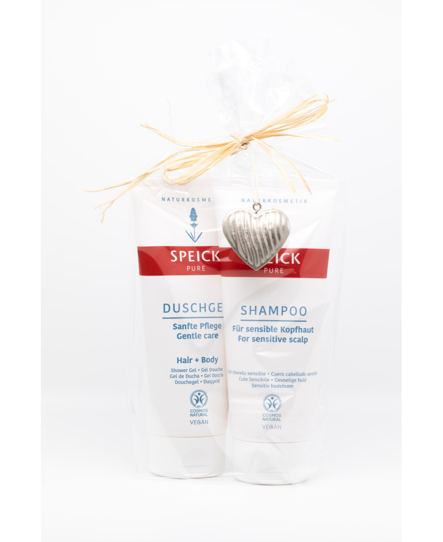 Gift set consisting of a Speick Pure Shower Gel (200ml) and a Speick Pure Shampoo (200ml). The products are packaged in a cellophane bag, closed with a raffia bow and decorated with a Christmas ornament